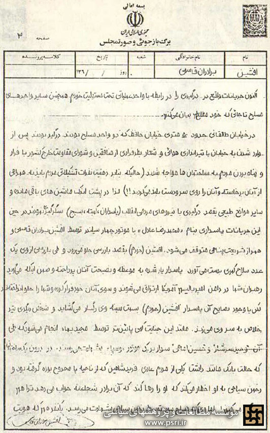 افشین برادران قاسمی درباره جنایت خود نیز نوشته است: « آنان در پشت اندک ماشینهای باقیمانده و سایر موانع طبیعی به قصد درگیری با نیروهای مردمی انقلاب (پاسداران، کمیته، بسیج) سنگرگیری نمودند. در حین این جریانات، پاسداری به نام محمدرضا عادل با موتور چهار سیلندر توسط افشین برادرانقاسمی و همراز شریعتپناهی متوقف میشود. افشین (خودم) به قصد بازرسی جلو میرود و طی بازرسی از وی یک عدد سلاح کمری بهدست میآورد. پاسدار یادشده به موعظه و نصیحت آنان پرداخته و ضمن این که میگوید رهبران شما در دامن امپریالیسم آمریکا ارتزاق میشوند و به سوی آنان فرار کرده و شما را جلو انداختهاند، لیکن با وجود نصایح آن پاسدار، افشین (خودم) به سمت سینهٔ وی رگبار میگشاید و شخص دیگری تیر خلاص به سر وی میزند.»