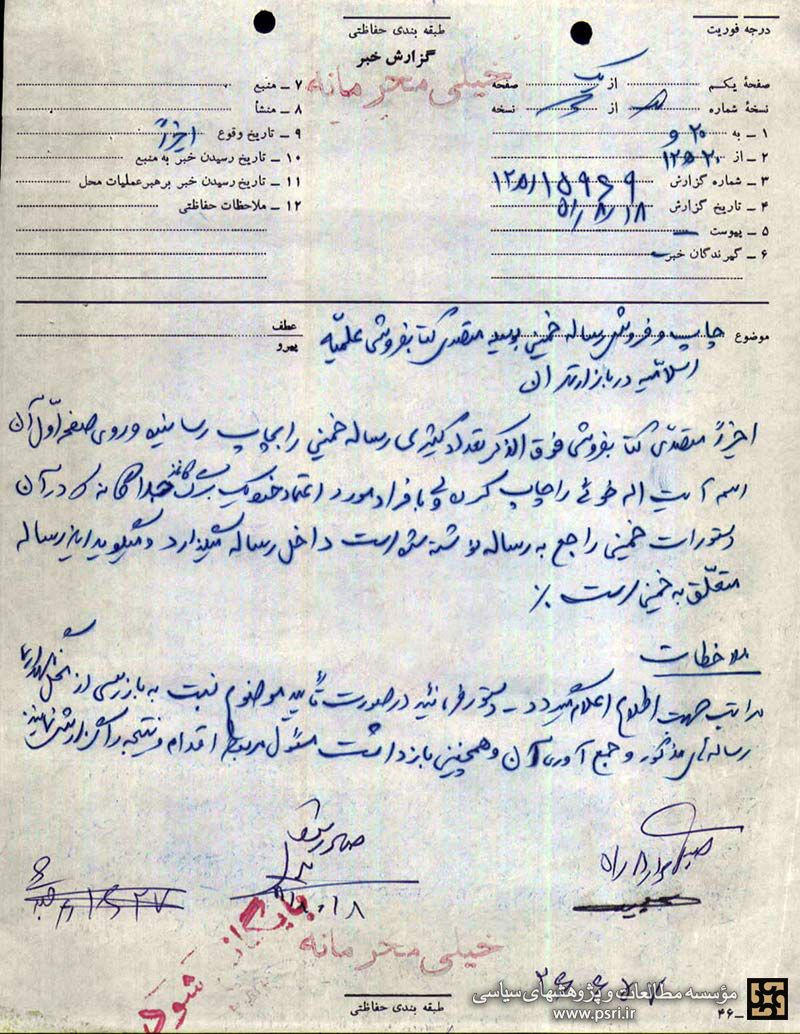 مراتب جهت اطلاع اعلام میگردد. دستور فرمایید در صورت تایید موضوع نسبت به بازرسی از محل نگهداری رسالههای مذکور و جمعآوری آن و همچنین بازداشت مسئول مربوطه اقدام و نتیجه را گزارش نماید.