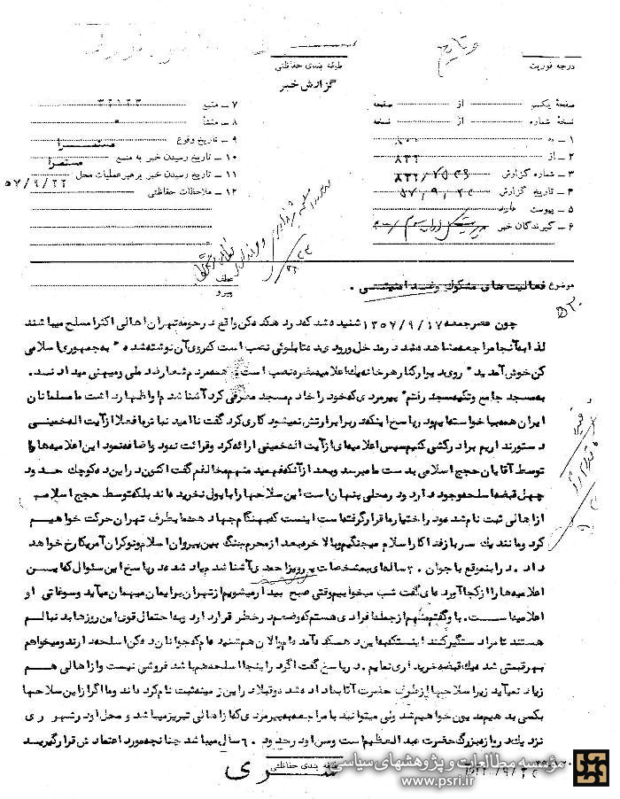 گزارش خبر موضوع : فعالیت های مشکوک و ضد امنیتی چون عصر جمعه ۱۷ /۹ /۱۳۵۷ شنیده شد که در دهکده کن واقع در حومه تهران اهالی اکثرا مسلح میباشند لذا به آنجا مراجعه مشاهده شد در مدخل ورودی ده تابلوئی نصب است که روی آن نوشته شده «به جمهوری اسلامی کن خوش آمدید» روی دیوار کنار هر خانه یک اعلامیه مضره نصب است.