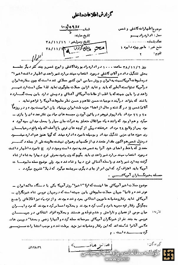 روز ۳۸/۱۱/۶ ساعت ۱۰ در اداره رادیو، رضا کاشفی و ایرج شمس و چند نفر دیگر جلسه بحثی تشکیل داده و آقای کاشفی در مورد انتصاب مهندس اردشیر زاهدی [به سفارت ایران در آمریکا][۱] اظهار داشت اخیراً در مطبوعات آمریکا نسبت به ایران و روش سیاسی این کشور حملاتی شده است که چون سفارت ایران در آمریکا نتوانسته آنطور که باید و شاید از این حملات جلوگیری نماید، لذا ممکن است اردشیر زاهدی را به این جهت که با اغلب از مقامات آمریکایی آشنایی و دوستی دارد به این پست گمارده باشند که بتواند در آینده موجبات حسنتفاهم و حسننظر مطبوعات آمریکا را فراهم نماید.